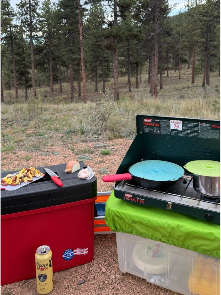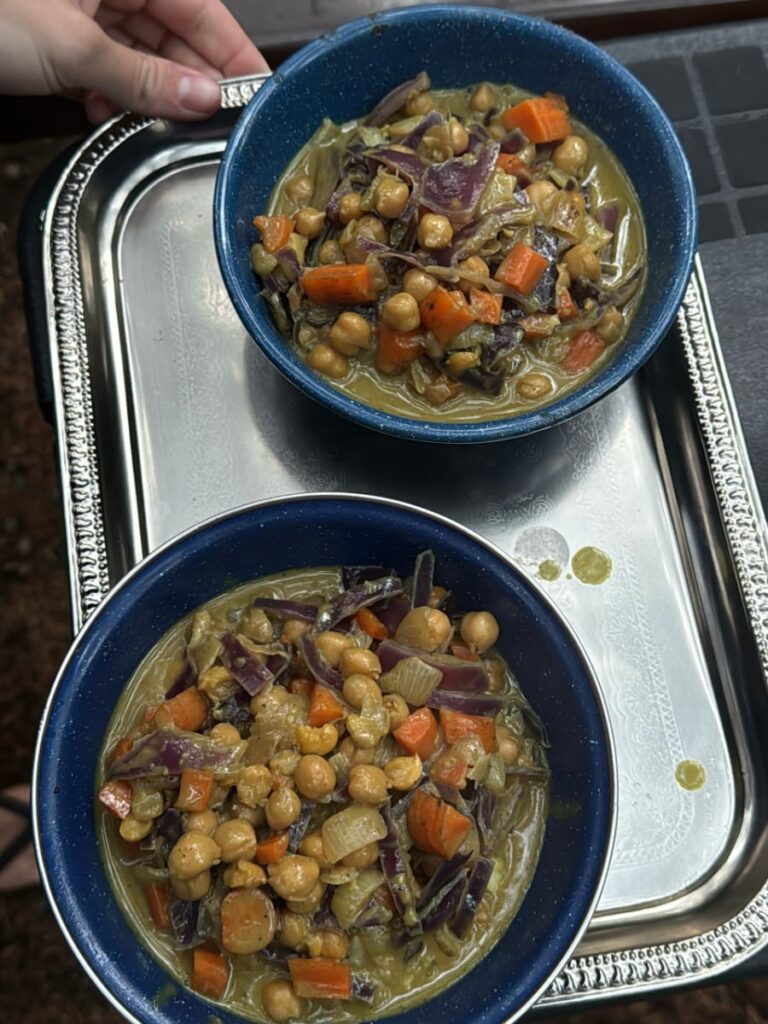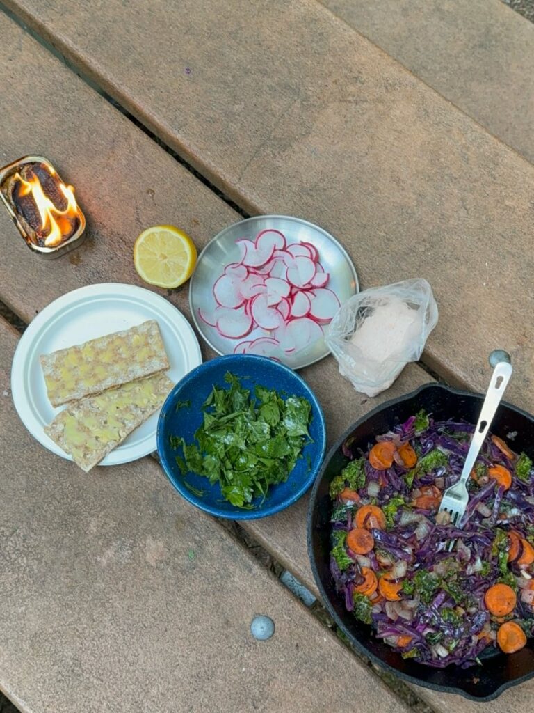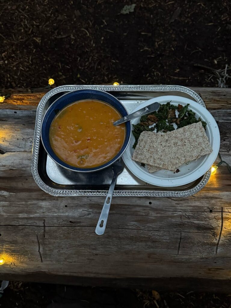 We restocked at small natural grocery stores with bulk sections, keeping our meals centered around hardy produce, grains, legumes, and shelf stable proteins. Cooking on our two burner Coleman stove under the trees reminded us that healthy camp cooking can be simple, flavorful, and deeply satisfying.