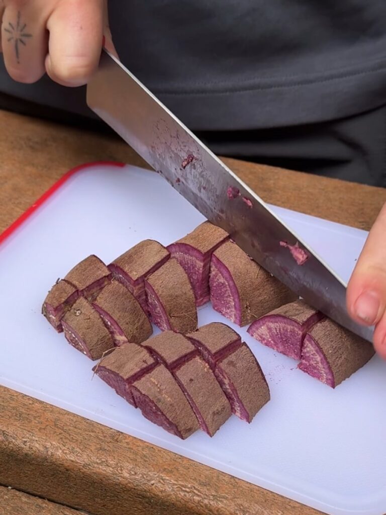 - Steam cubed sweet potato in water.