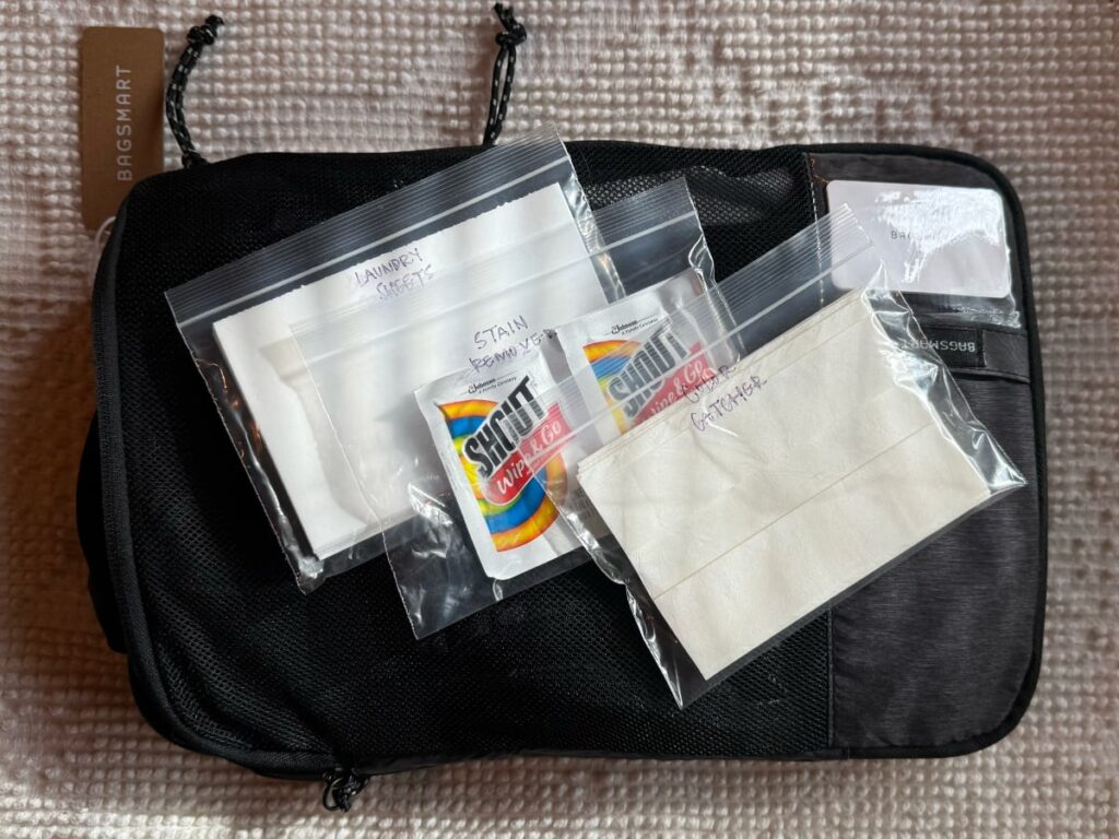 Start with one packing cube and commit to it. This keeps your laundry supplies contained and prevents them from spreading throughout your bag or getting lost.